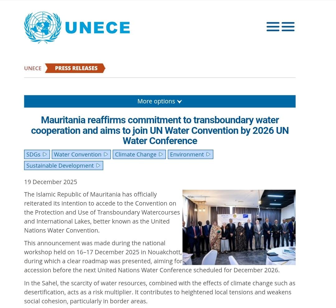 ويُعد هذا التأكيد والمبادرات الوطنية المتصلة به، جزءًا من التزام موريتانيا ببناء إطار قانوني ومؤسسي تعاوني لإدارة الموارد المائية العابرة للحدود، وتعزيز قدرتها على مواجهة التحديات المرتبطة بتغير المناخ والنمو السكاني والطلب المتزايد على المياه، وفق ما ورد في تقرير اللجنة الاقتصادية لأوروبا.