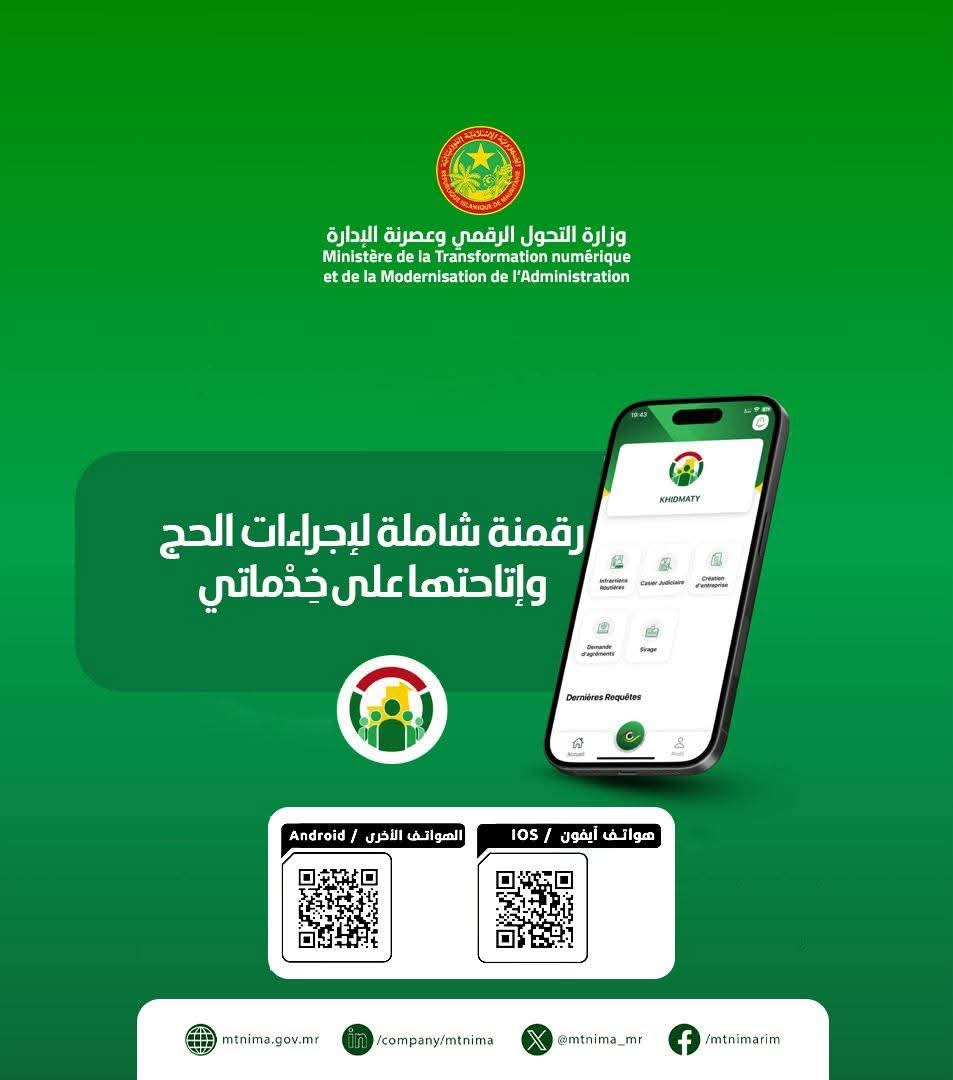 شهد وزير التحول الرقمي أحمد سالم بده، ووزير الشؤون الإسلامية، ولد سيداتي ولد أحمد لولي، عملية إتاحة خدمات الحج على بوابة الخدمات العمومية الرقمية، خِدْماتي.