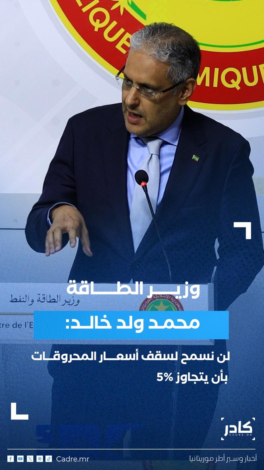 أكد وزير الطاقة محمد ولد خالد أن الدولة لن تسمح بتجاوز ارتفاع المحروقات لنسبة 5%، مستدركا أن استراتيجية دعم المحروقات (الديزل والبنزين والغاز) لازالت مستمرة حتى الآن.