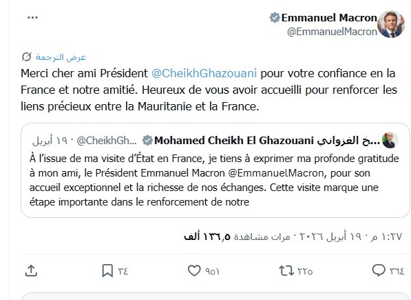 وأعرب ماكرون، في تغريدة عبر حسابه على موقع X، عن خالص شكره وتقديره للغزواني، على زيارة الدولة التي أجراها إلى باريس.