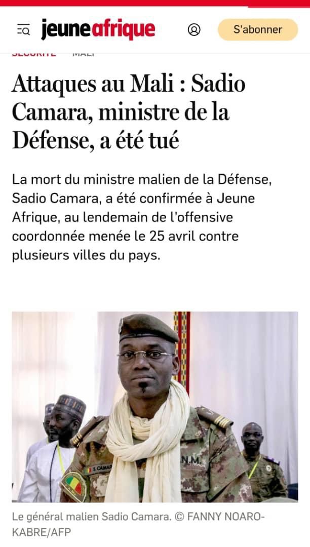أفادت صحيفة جون آفريك، بوفاة وزير الدفاع المالي، صاديو كامارا، في هجوم أمس، الذي استهدف عدة مدن مالية.