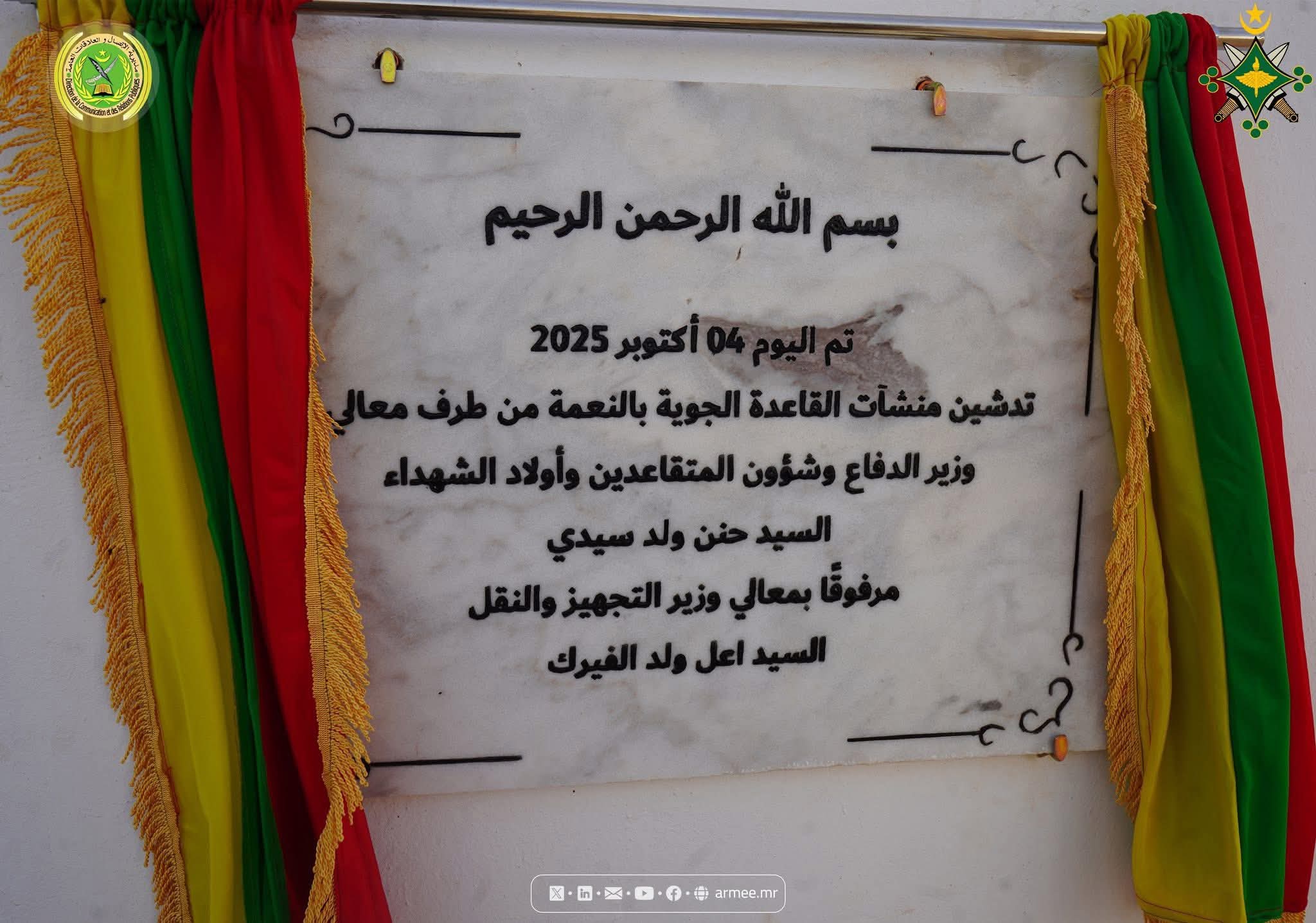 دشن وزير الدفاع، حنن ولد سيدي، والتجهيز والنقل؛ اعل سيد أحمد الفيرك، وقائد الأركان العامة للجيوش؛ الفريق محمد فال الرايس الرايس، وقائد أركان الجيش الجوي؛ وقائد أركان الدرك الوطني؛ عدة منشآت بالقاعدة الجوية في مدينة النعمة.